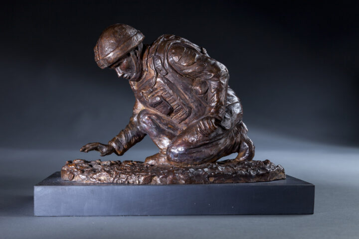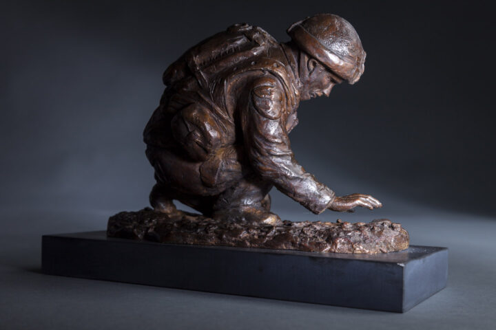 In 2009, her younger son – a soldier in the British army – was severely wounded after he stepped on a homemade bomb in the Afghan province of Helmand. Her bronze military sculptures are a consequence of this.